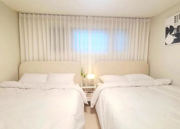 The 50 m² Song Stay-공항철도, 홍대입구역 7분, 연트럴파크 5분, 6명, 2룸, 3퀸베드, 각방 에어컨, 세탁건조기, Wifi, 연남동, 외국인 전용 Seoul apartment lies merely 1.2 km from the Hongik University Street and about 10 minutes' walk from Hongik University tube station. The apartment is situated approximately 10 minutes' drive from Seoul train station and only steps away from Cheonggiwa Wedding Hall bus station.